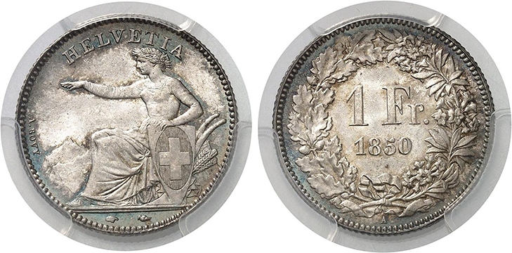 С целью решения этой проблемы в первой Швейцарской федеральной конституции 1848 года было оговорено, что новое федеральное правительство будет единственным учреждением в Швейцарии, имеющим право денежной эмиссии. Принятый федеральным собранием 7 мая 1850 года закон о федеральной монетной системе утвердил швейцарский франк в качестве национальной валюты. Вместе с тем, с 1865 до 1927 года Швейцария являлась членом Латинского монетного союза, поэтому в этот период золотые и серебряные монеты Франции, Бельгии, Италии и Греции также имели хождение в Швейцарии в качестве официального платёжного средства.